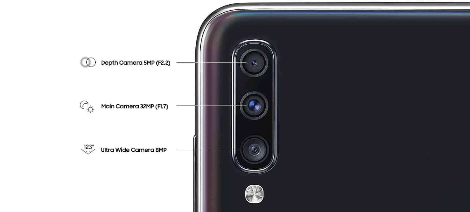 يأتي هاتف Samsung Galaxy A70 بكاميرا رئيسية ثلاثية فالكاميرا الأولي بدقة 32 ميجابكسل وبفتحة عدسة f/1.7 وتدعم التركيز التلقائي والثانية بدقة 8 ميجا بيكسل مع فتحة عدسة f/2.2 وبزاوية عرض واسعة 123 درجة والثالثة مُخصصة للعمق بدقة 5 ميجا بيكسل مع فتحة f/2.2 بالإضافة إلى دعم ميزة HDR وإمكانية التقاط صور بانورامية .