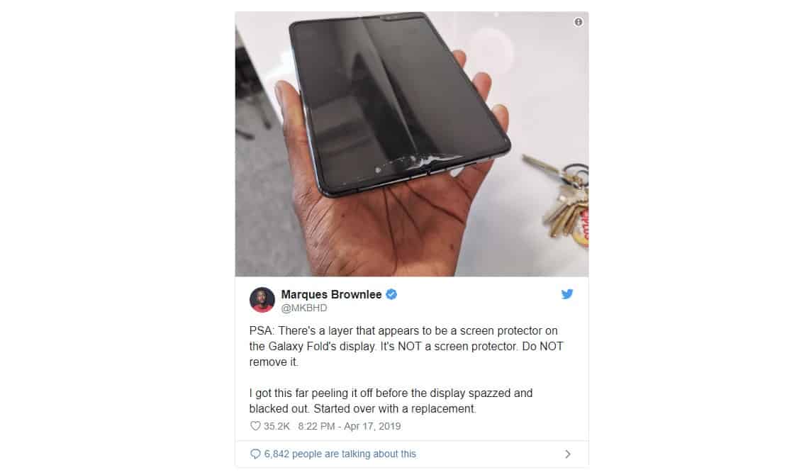 قبل إعلان سامسونج لهاتف Galaxy Fold رسمياً ظهرت مشكلة في شاشة الهاتف ومثلما نقول تأتي الرياح بما لا تشتهي السفن وبدأت المشكلة عند نزع طبقة موضوعة علي الشاشة تبدو أنها طبقة واقية للشاشة ويبدو أن هذه الطبقة تساعد الشاشة في التماسك ولكنها طبقة بلاستيكية لحماية الشاشة وتحدث عن هذه المشكلة موقع The Verge حيث جاء بما يلي ” فإنه من المتوقع أن تكتب سامسونج تحذيراً للمستخدمين بعدم نزع طبقة الحماية على الشاشة عند الاستخدام ولكن بكل الأحوال ننتظر تفسير سامسونج لهذه المشكلة الكبيرة ” وقالت سامسونج ” عدد محدود من عينات Galaxy Fold تم تزويدها لوسائل الإعلام للمراجعة فقط وقد وصلتنا تقارير محدودة متعلقة بمشاكل في الشاشة الرئيسية من العينات التي طرحناها وسنقوم بشكل شخصي (في كوريا) بفحص تلك الهواتف للوقوف عن سبب المشكلة الرئيسي ” .