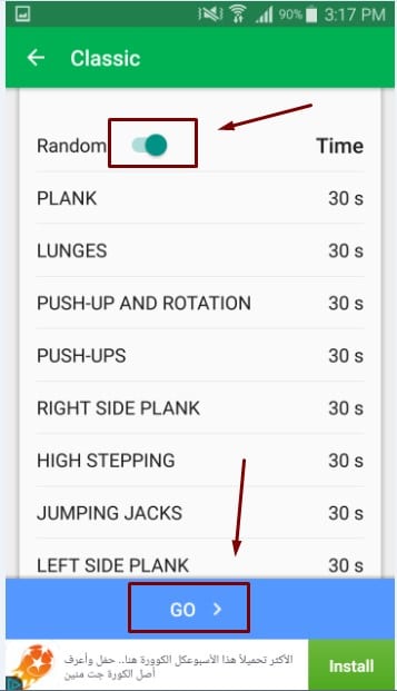أولاً : بعد تحميل التطبيق بالطريقة المعتادة من خلال متجر جوجل بلاى قوم بالضغط على فتح أو open لتجد الشاشة الرئيسية للتطبيق و منها تختار التمرين الذي تريد تأديته كما موضح أمامك في الصورة التالية :