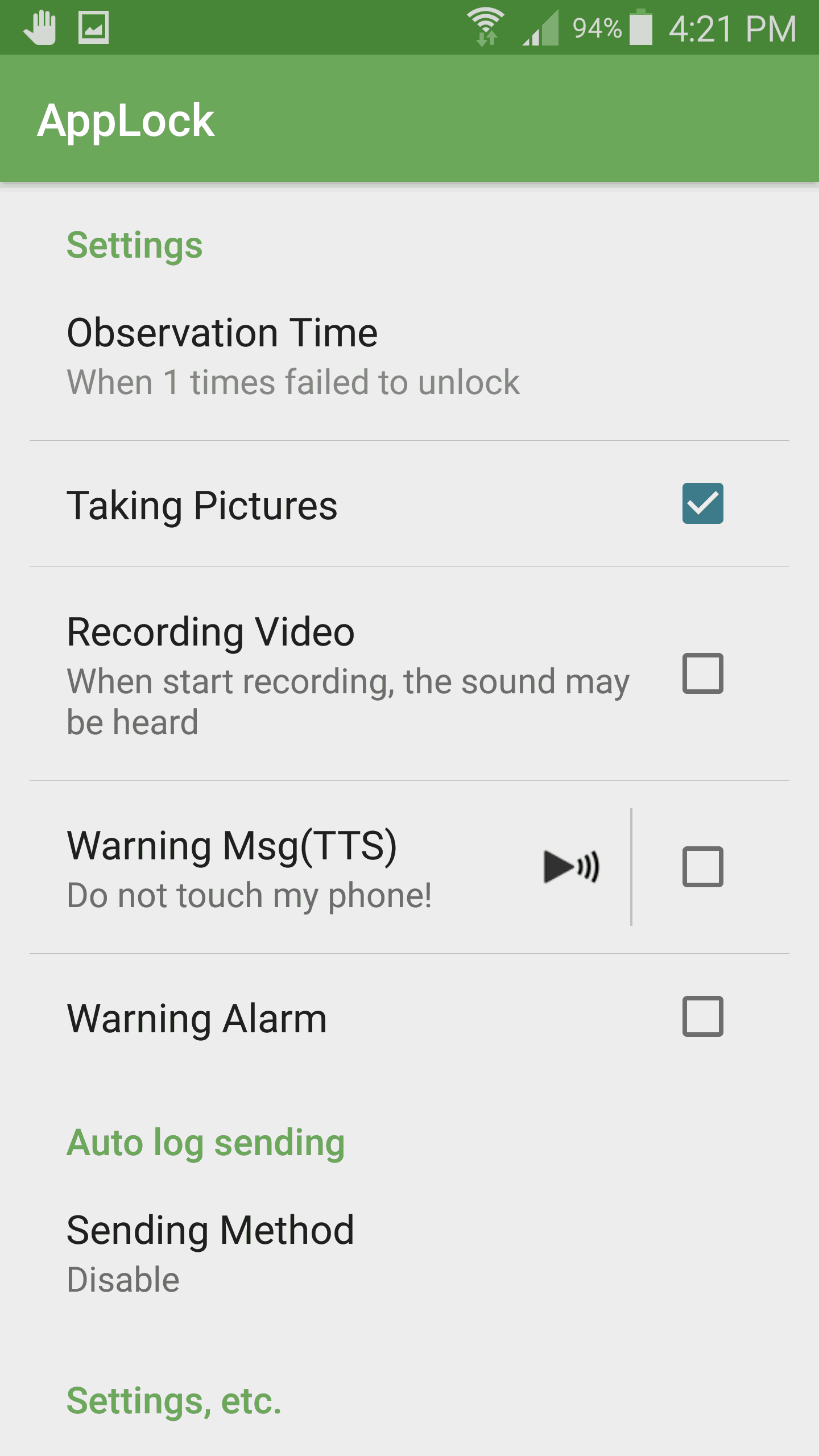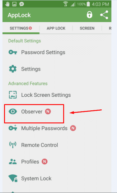 رابعاً : أهم خاصية وجدتها في هذا التطبيق هو إن تطبيق AppLock – Fingerprint يقوم بتصوير إي شخص يحاول فتح الرقم السري الذي وضعته على هاتفك و لتفعيل هذه الخاصية تقوم باتباع الصور التالية :