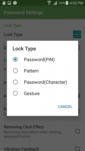 أولاً : للتمتع بمميزات هذا التطبيق عليك تحميله من الرابط الموجود أسفل المقال من خلال متجر جوجل بلاي وبعد تحميله على هاتفك و تثبيته بالطريقة المعتادة قم بالضغط على فتح أو Open لتجد التطبيق يقوم بفتح هذه الشاشة و يطلب منك وضع حماية كما موضح بالصورة التالية :
