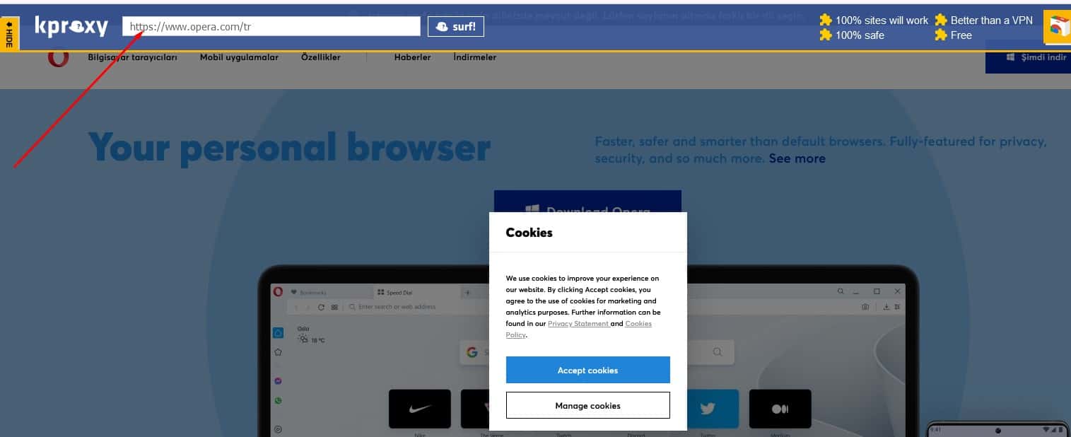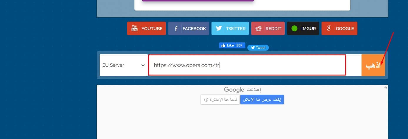 - بعد ذلك قم بالدخول إلي الموقع المحجوبة في بلدك على سبيل المثال قم بالدخول إلي موقع أوبرا قم بنسخ رابط الموقع .