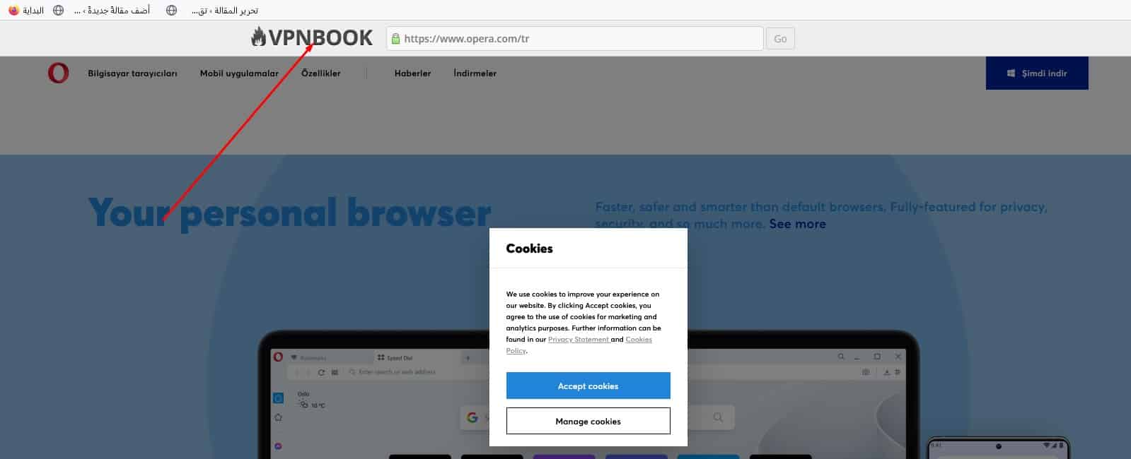 - وستجد مباشرة أننا قمنا بفتح موقع أوبرا بواسطة VPNBook ببساطة وهو افضل موقع لفتح المواقع المحجوبة للكمبيوتر .