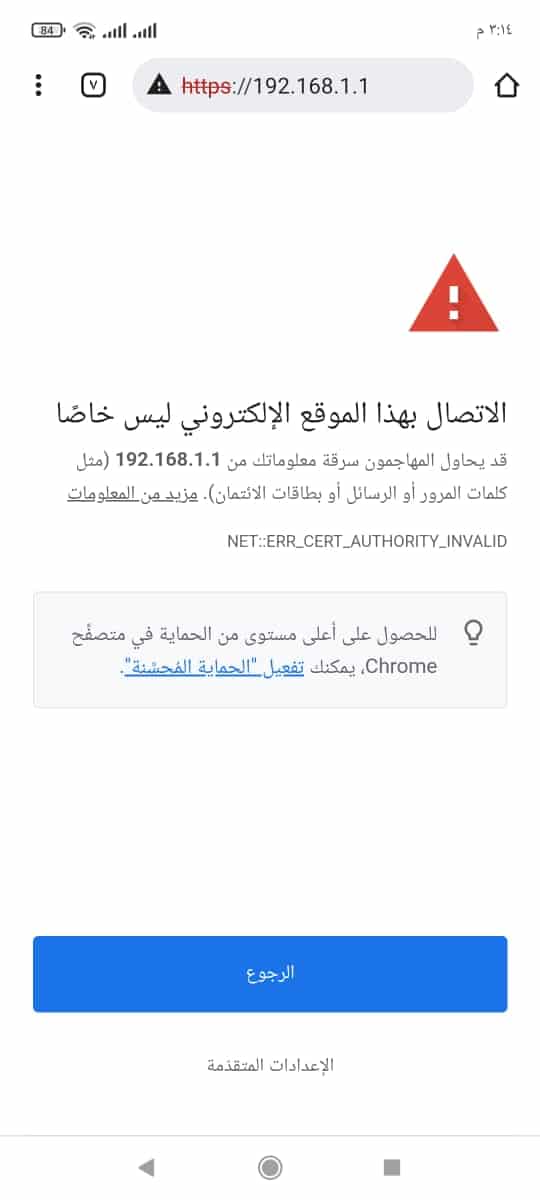 - الخطوة الأولي قم بفتح متصفح جوجل كروم أو أي متصفح أخر وقم بكتابة في شريط البحث هذا الرقم 192.168.1.1 ومباشرة ستنتقل إلي صفحة إعدادات شبكة WE قم بالضغط على خيار إعدادات متقدمة كما موضح بالصورة التالية .