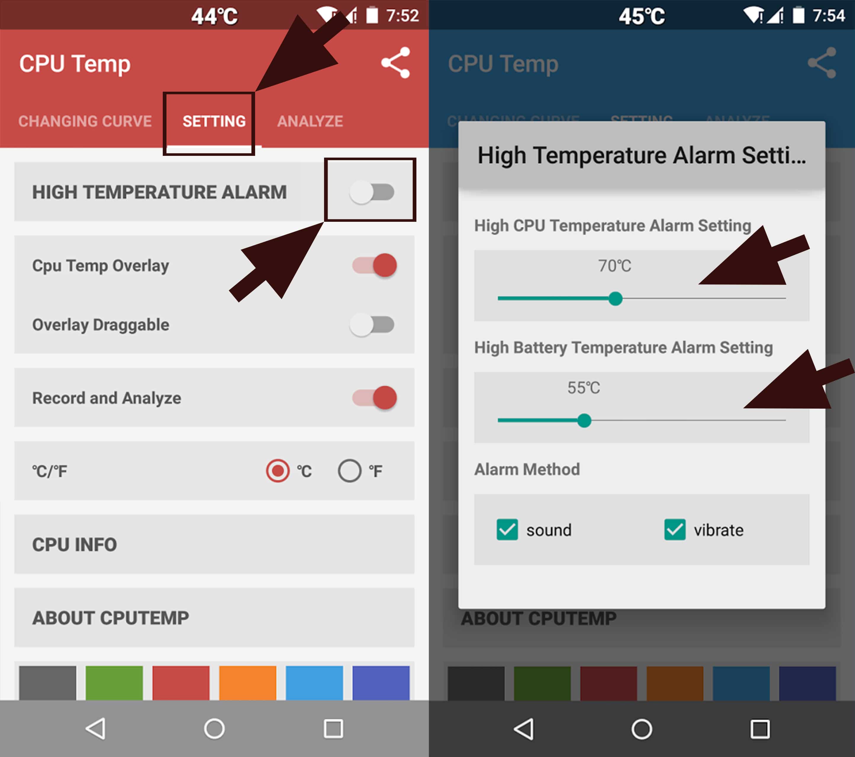 ثانياً : تقوم بالضغط على الإعدادات لتجد خاصية المنبه التي تعمل عند ارتفاع درجة الحرارة عن المعتاد وبالضغط عليها مرتين تظهر لك قائمة لتحديد درجة الحرارة القصوي التي تريدها وإذا زادت عن ذلك يقوم الإندار بإخبارك كما موضح أمامك في الصورة التالية :
