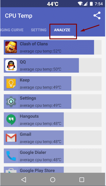 ثالثاً : كما يمكنك الدخول على قائمة التحليل لمعرفة درجة حرارة كل تطبيق على حده كما هو موضح بالصورة الموجودة أمامك :