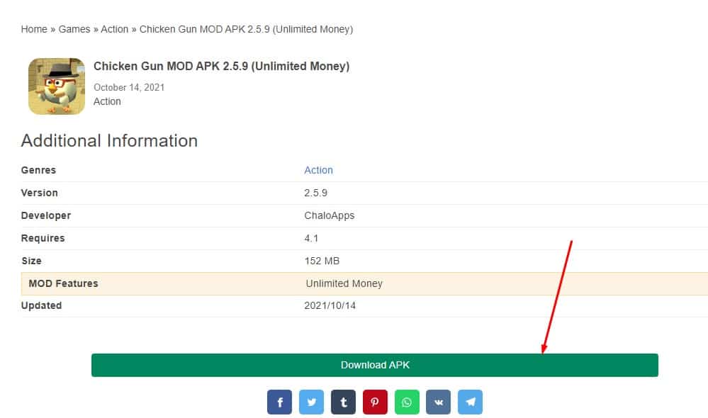 - على سبيل المثال سنقوم بتحميل لعبة chicken GUN MOD كما موضح بالصورة التالية وستقوم بالضغط عليها .
