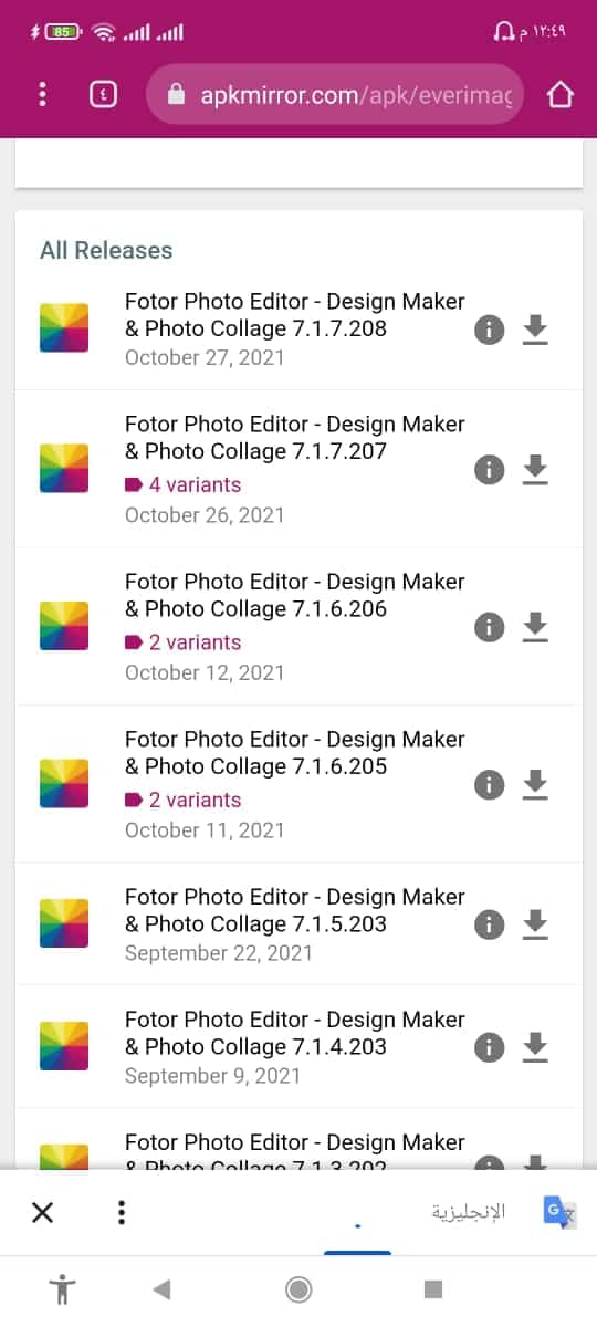 - ثم ستظهر أمامك هذه الواجهة وقم باختيار من بينهم الإصدار الذي تريد أن تقوم بتحميله للتطبيق وفي لمح البصر ستجد أن التطبيق تم تحميله على هاتفك الاندرويد .