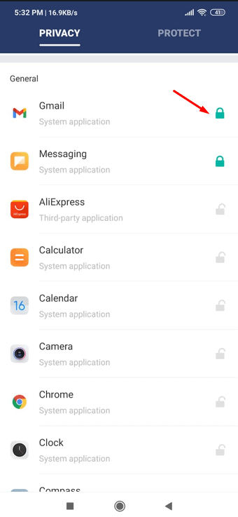 - ثم نقوم بتحديد التطبيقات التي نريد تعين كلمة مرور لها من خلال تفعيل رمز القفل كما هو في تلك الصورة التالية .