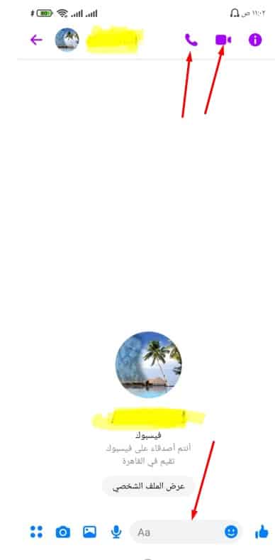 • وتستطيع الآن أن تستخدمه بكل سهولة وبساطة قم بفتح الدردشة بينك وبين الصديق الذي تريد أن تراسله وستجد أمامك علامة اجراء المكالمات الصوتية ومكالمات الفيديو أو في الأسفل تستطيع أن تقوم بكتابة المراسلات النصية كما موضح بالصورة التالية .