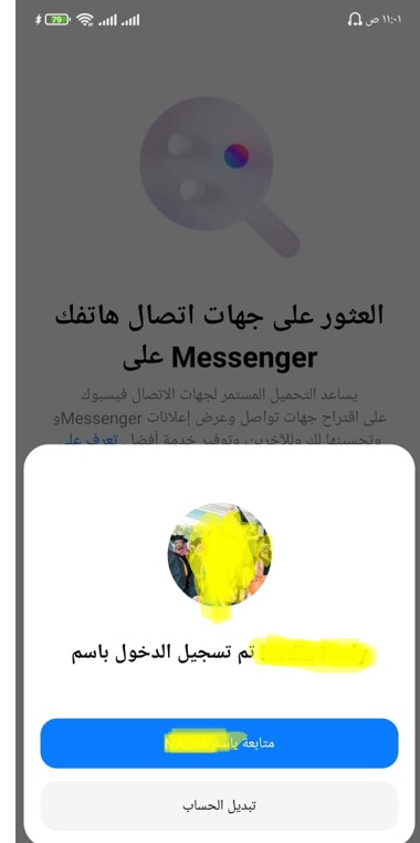 • وكما نعرف جميعا أن تطبيق ماسنجر يحتاج إلي تطبيق فيسبوك حتي تستطيع أن تستخدمه فسيقوم بسؤالك هل تريد المتابعة باسم .