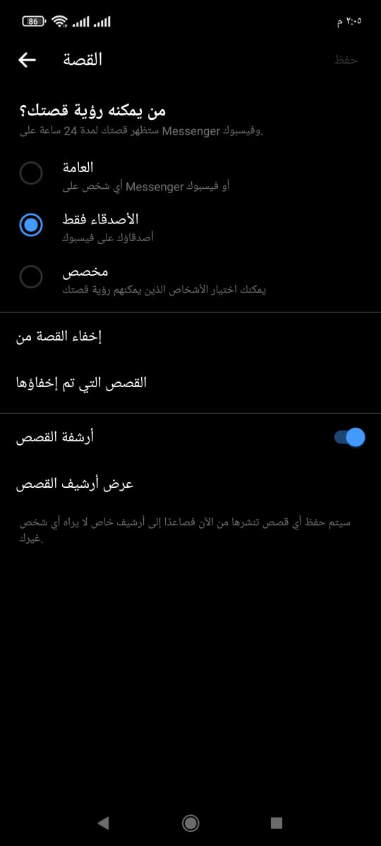 • وستجد أمامك مجموعة من الخيارات قم بالضغط على خيار من يمكنه رؤية قصتك العامة أو الأصدقاء فقط أو مخصص والعديد من الخيارات الأخري كما موضح بالصورة التالية .