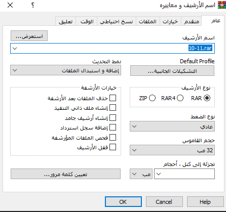 - بعد ذلك ستظهر لنا الواجهة التالية كما هو في الصورة التالية وهي تحتوى علي العديد من الصيغ التي نستخدمها في عملية ضغط الملفات وهل تريد تعيين كلمة سر لها أم لا وبعد ذلك نقوم بالضغط على خيار OK .