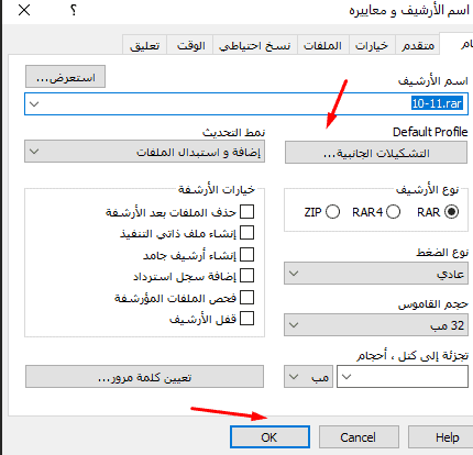 • بغد ذلك سوف تظهر لنا تلك الواجهة وهي تحديد صيغ الملفات التي نريد ضغطها وهل نريد تعيين كلمه سر لتلك الملفات أم لا وبعد الانتهاء من تعيين الصيغ تحديد كلمه السر نقوم بالضغط علي خيار OK حتي يتم ضغط الملفات .
