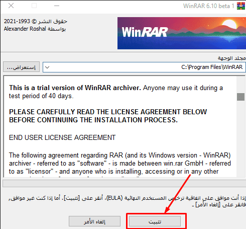 • بعد أن قمنا بتنزيل برنامج WinRAR ويندوز 10 بنجاح نقوم بالضغط على خيار تثبيت حتي يبدأ البرنامج في عملية التثبيت على الحاسوب الخاص بنا .