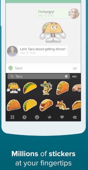 ويمكنك أيضاً من خلال تطبيق Fleksy أن تقوم بإرسال المئات من Stickers المبهجة والتي تضيف السعادة والروح إلي المحادثات الخاصة بك .