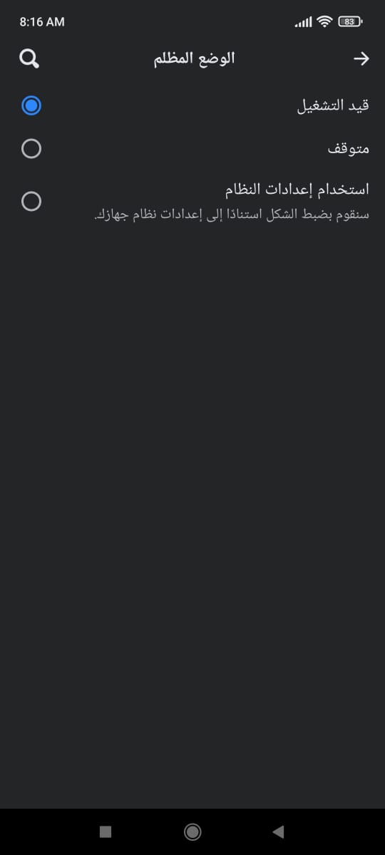 - ثم قم بالضغط على تشغيل الوضع المظلم كما بالصورة التالية وكما رأيت أن الأمر بسيط للغاية ولا يحتاج منك القيام بالكثير من الخطوات .