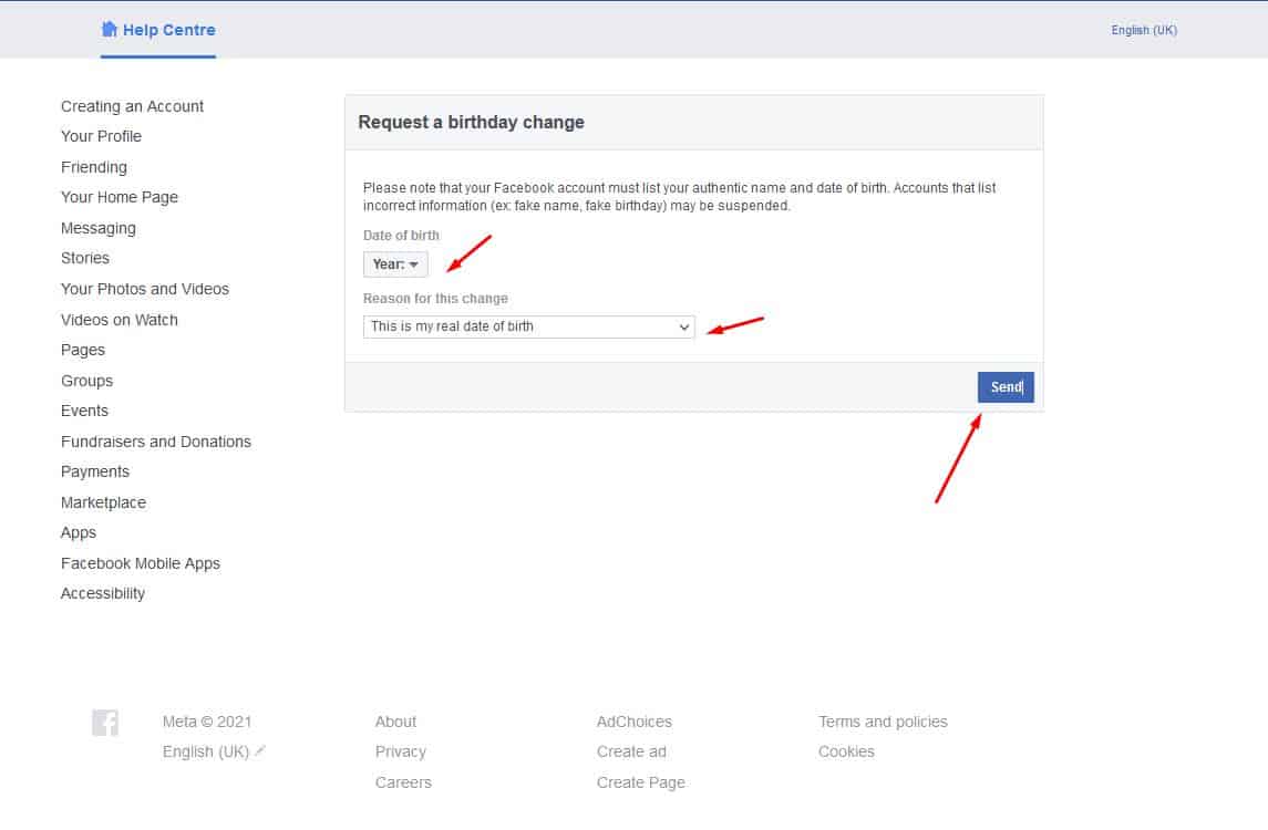 - ثم نقوم بالضغط على Reason for this change أو سبب تغير ذلك حتي نقوم باختيار السبب الذي دفعنا لتغير تاريخ الميلاد الخاص بنا .