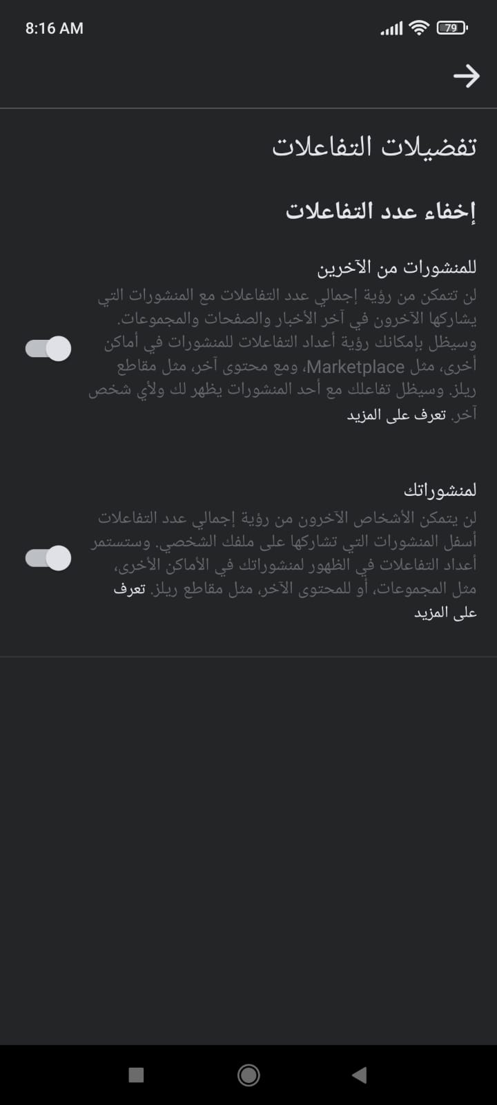 - في الخطوة الثالثة ستظهر أمامك هذه الواجهة قم بتفعيل ميزة إخفاء اللايكات لمنشوراتك أو منشورات الاخرين وبذلك تكون قد تعرفت على طريقة اخفاء عدد اللايكات في الفيس بوك .