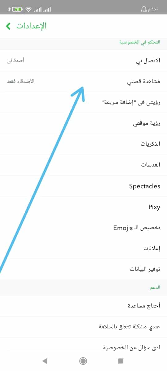 • وبعد أن تنتقل إلى الإعدادات سوف يظهر أمامك مجموعة كبيرة من الخيارات، قم بالضغط على خيار مشاهدة قصتي كما بالصورة التالية بالضبط .