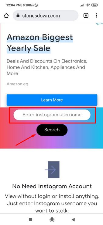 - ثم نقوم بالضغط على زر Search وذلك حتي يتمكن الموقع من البحث عن الحساب الذي نريد مشاهدته وعرض القصة الخاصة به .