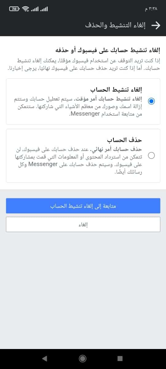 • بعد ذلك سوف تنتقل إلي خيارات حذف الحساب مؤقتاً أو دائماً لتحدد إذا كنت تريد استعادة الحساب مرة أخري .