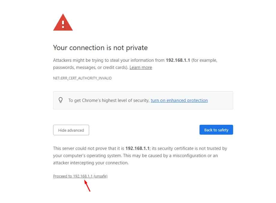• بعد ذلك قم بالضغط على خيار Proceed to 192.168.1.1 (unsafe) كما هو بتلك الصورة بالضبط؛ من أجل البدء في عملية الدخول إلى صفحة إعدادات الراوتر.
