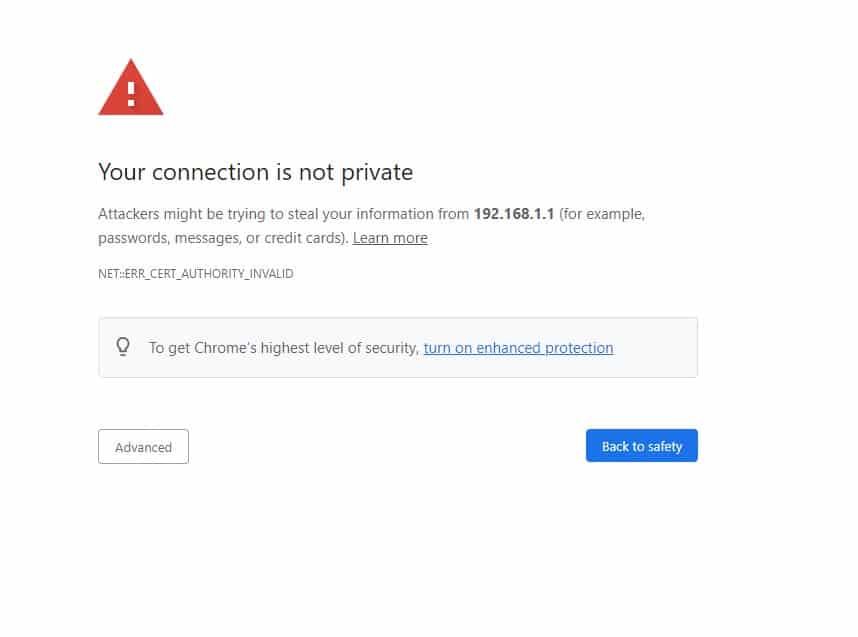 •  سوف تنتقل إلى صفحة بها تحذير من عدم خصوصية هذه الصفحة، قم بالضغط على Advanced، ثم اختر Proceed to 192.168.1.1 (unsafe).