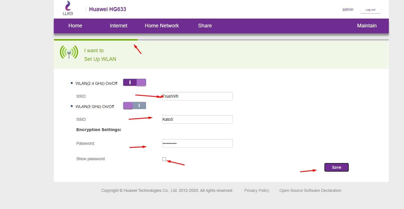 • وعلى الفور سيتم تحويلك إلى تلك الصفحة، وكما هو واضح تلك الصفحة تحتوي على الكثير من المعلومات التي تخص شبكة الواي فاي، فقط ستقوم بالضغط على Show Password من أجل إظهار كلمة سر الواي فاي الجديدة، ويمكنك بعد ذلك تغيير كلمة السر كما تريد، وفيما يتعلق بكلمة السر، فلقد أوضحت لكم من خلال الفقرات السابقة ما هي الخطوات التي عليك القيام بها حتى تتمكن من الحصول على أفضل كلمة سر.