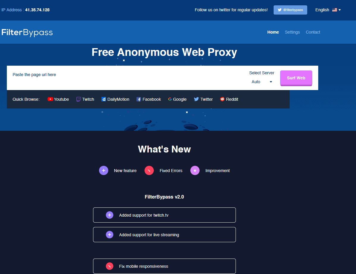موقع Filter Bypass من المواقع الشهيرة عالمياً التي تقدم خدمات فتح المواقع المحجوبة ونتمكن من خلالها فتح جميع المواقع التي نريدها بكل سهولة ودون الشعور بالتقيد وعدم الحرية في استخدام مواقع الإنترنت التي نريدها فالموقع يقدم لنا تلك الخدمات بشكل مجاني تماماً بجانب أنه يقدم لنا العديد من المميزات الرائعة التي تميزه عن المواقع الأخري فالموقع يقدم لنا خدمات البروكسي درجة عالية من الأمان ونستطيع التصفح بكل حرية دون وجود أي خطورة علينا والحصول على أكبر قدر من الخصوصية والحفاظ علي البيانات الخاصة بنا وعدم جمعها نهائياً ويمكننا الذهاب إلي الموقع بمجرد الضغط هنا .