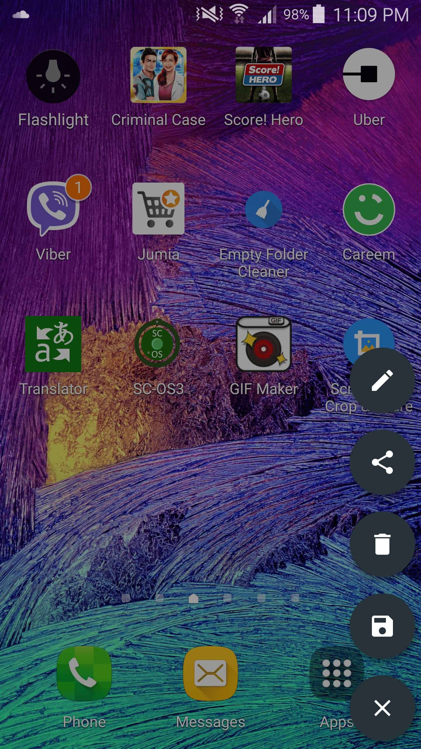 - بعد السماح له بالعمل على هاتفك يجب أن تقوم بإخذ screenshot كما تعمل بالضغط على الزر الرئيسي Home + زر فاتح وقفل الهاتف Power أو حسب طريقة هاتفك وبعدها سيظهر لك أيقونات للتحكم على الجانب الأيمن من الشاشة كما موضح بالصورة الأتية :