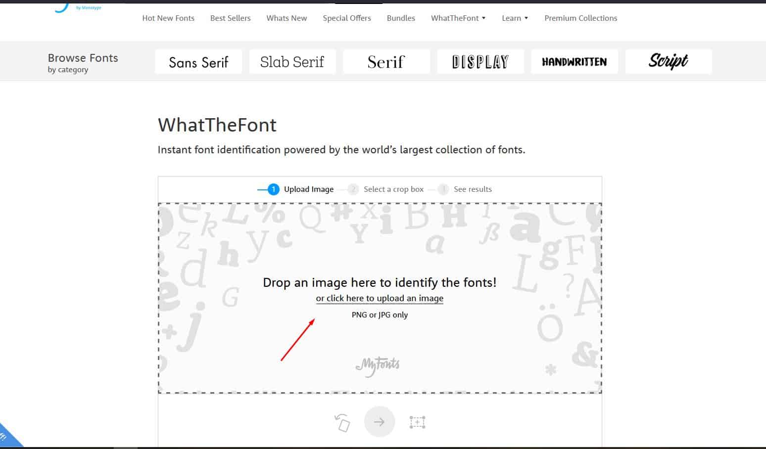 يعتبر موقع myfonts.com هو الأداة الأكبر التي نستطيع من خلالها البحث عن خط عربي بالصورة بكل سهولة فيحتوى الموقع على مكتبة ضخمة تضم العديد من الخطوط اللاتينية والعربية لذلك هو يعتبر واحد من افضل الخدمات لإيجاد الخطوط من خلال رفع الصور ويحمل الموقع واجهة بسيطة وأنيقة تتميز بالسهولة فهو واحد من المراجع الأساسية للمصورين ولمحترفين للمعرفة نوع الخطوط ونستطيع استخدام الموقع من خلال الرابط التالي .