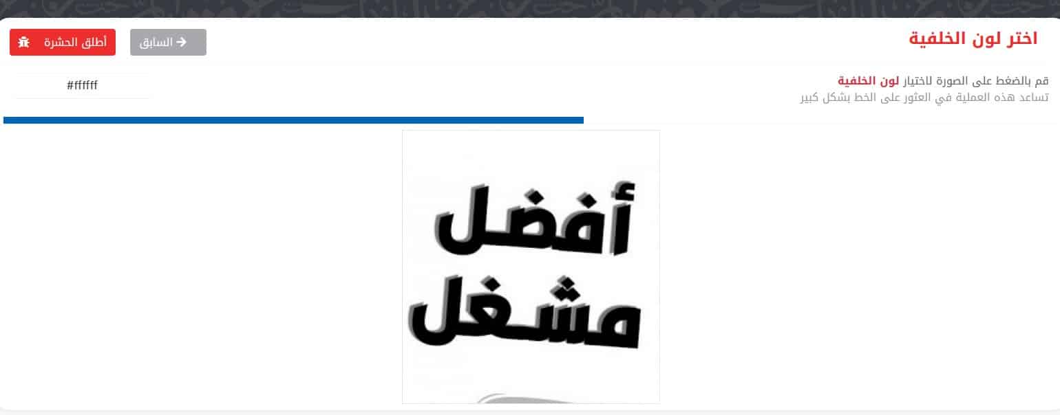 • بعد ذلك قم بتحديد لون الخلفية الخاصة بالنص بعد ذلك قم بالضغط على خيار اطلق الحشرة ومن الجدير بالذكر أن هذا الخيار هو المسئول عن البدء في عملية البحث على شبكة الإنترنت أو بمعنى أدق في البحث داخل قاعدة البيانات الخاصة بهذا الموقع وفي بعض الأحيان تستغرق تلك العملية بعض الوقت ولهذا كل ما عليك القيام به بعد تلك الخطوة هو الانتظار لحين الانتهاء من عملية البحث .