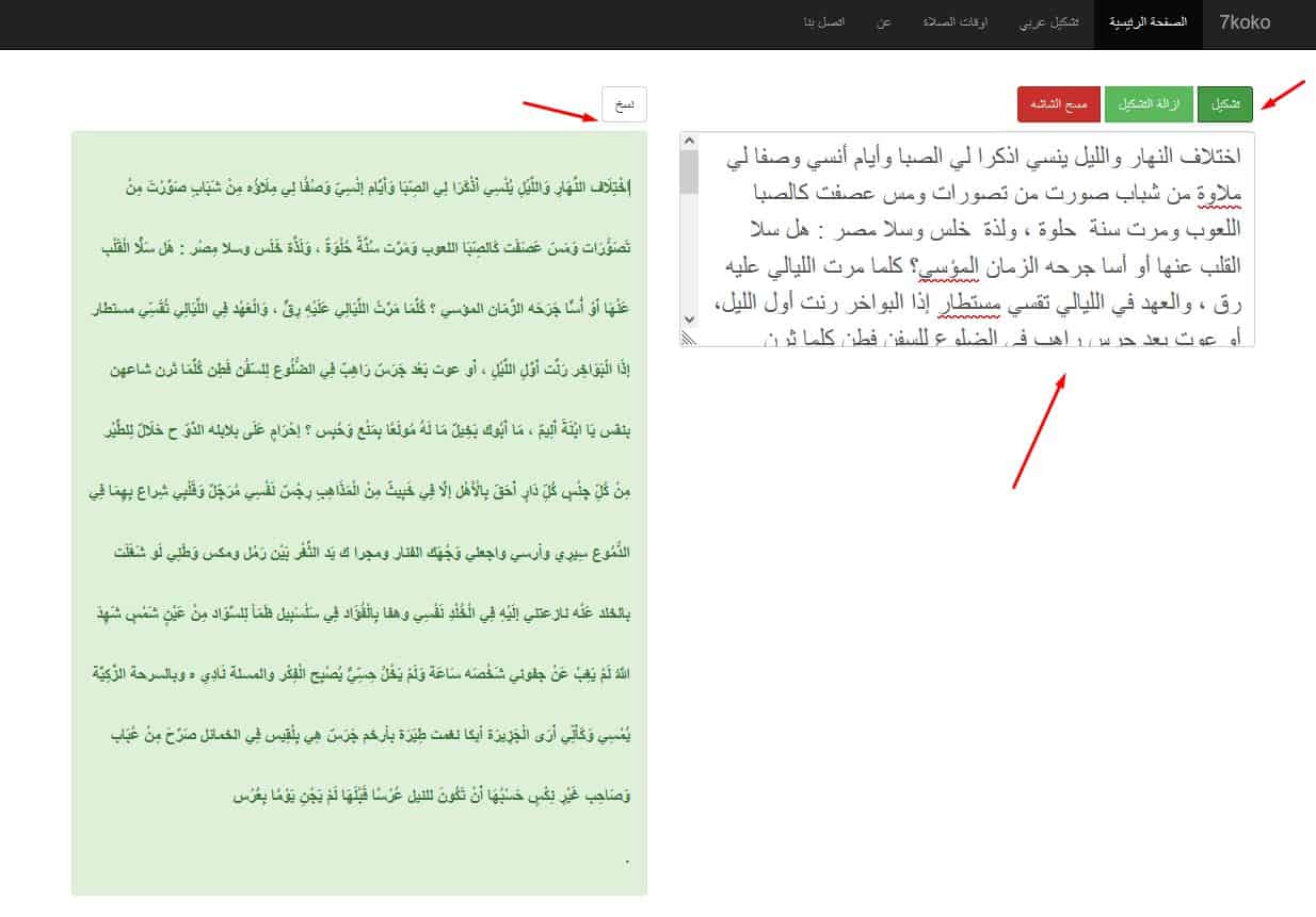 موقع 7koko هو واحد من المواقع الهامة لتشكيل اللغة العربية، فهو واحد من المواقع التي يستخدمها ملايين من المستخدمين حول العالم في عملية تشكيل الكلام، وذلك بسبب أن الموقع يحمل واجهة بسيطة تمامًا، تتناسب مع جميع المستخدمين، ونستطيع من خلاله تشكيل الكلام بكل سهولة وبشكل سريع، والموقع مجاني لا يتطلب منا أي رسوم مالية، ويوفر لنا الكثير من خيارات المساعدة، على الرغم من وجود الكثير من المواقع الأخرى التي يمكنك استخدامها في القيام بهذا الأمر، إلا وأن هذا الموقع هو الأفضل والأشهر على الإطلاق وأنصحكم جميعًا بالبدء في عملية الاستخدام، وسنتعرف عليها من خلال الفقرة القادمة .