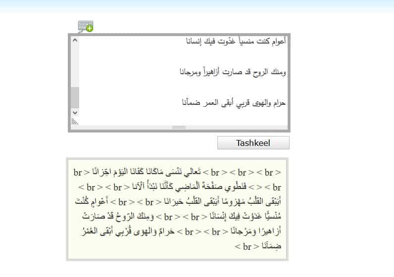 - بعد لصق القطعة نقوم بالضغط على خيار Tashkeel؛ ليقوم الموقع بتشكيل النص في الحال، ومن الجدير بالذكر أنه قد يكون هناك بعض المشاكل في عملية التشكيل، ولكن يمكنك تعديلها بالضغط على الكلمة التي تعتقد أنه تم تشكيلها بشكل خاطئ .