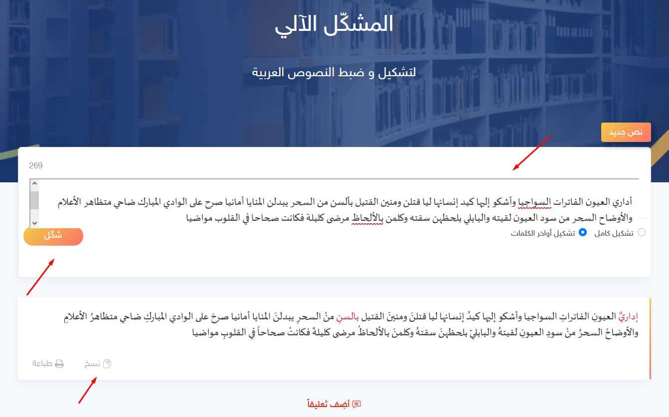 - ونستطيع نسخ الكلام بعد الانتهاء من عملية التشكيل، من خلال الضغط على زر نسخ الموجود أعلى الموقع .