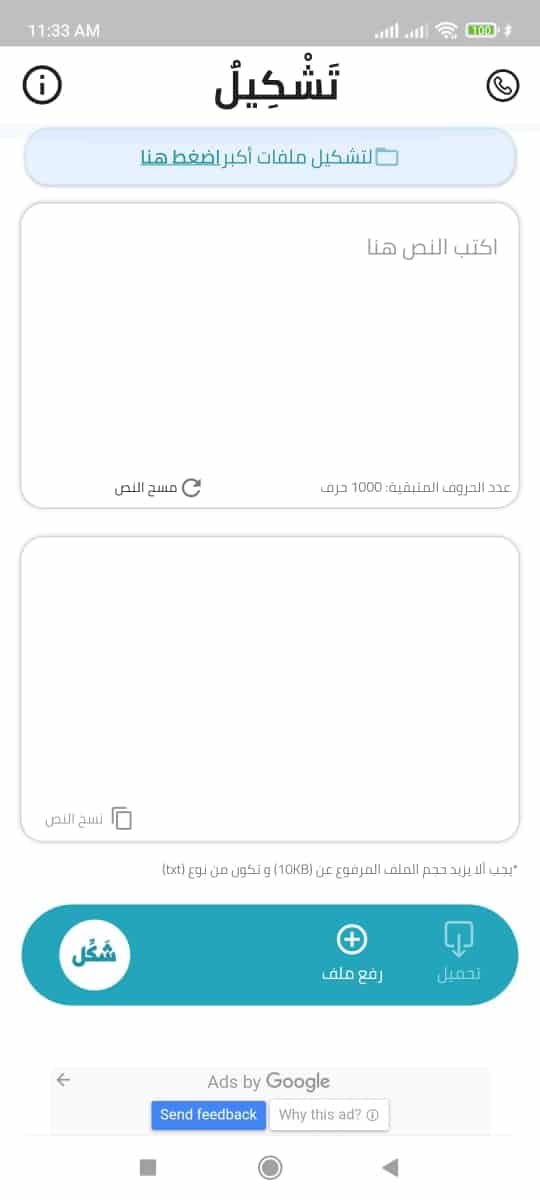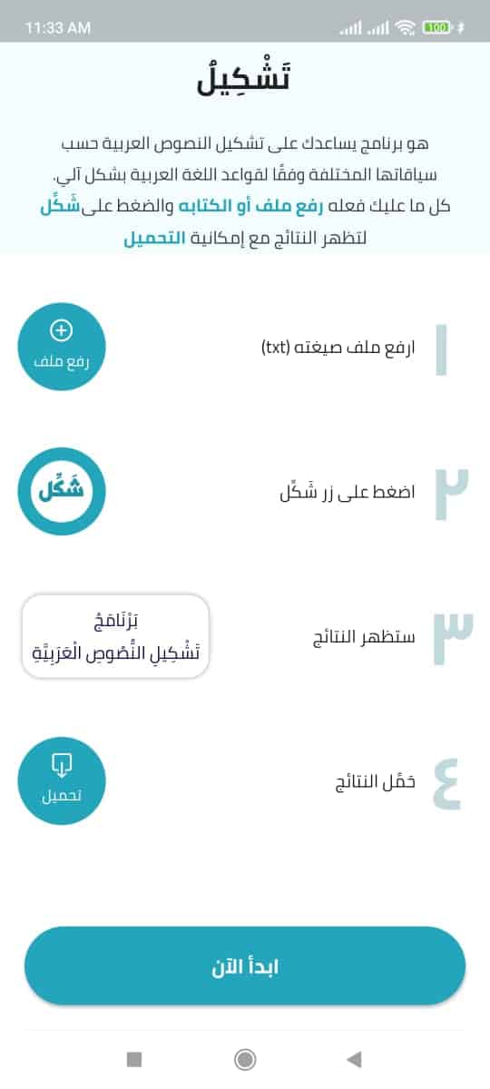 لتحميل البرنامج على هاتفك الأندرويد لابد أن تقوم بالضغط هنا، وستنتقل بعدها مباشرة إلى متجر جوجل بلاي، ومنه قم بالضغط على تثبيت أو Install، وفي لمح البصر ستنتهي عملية التحميل والتثبيت معًا، ولتحميل البرنامج على هاتفك الآيفون لابد أن تقوم بالضغط هنا، وستنتقل بعدها مباشرة إلى متجر آب ستور، ثم قم بالضغط على تثبيت أو Install، عملية التثبيت أيضًا لن تأخذ منك سوى لحظات معدودة، وبذلك نكون قد انتهينا من عملية تحميل برنامج تشكيل النصوص العربية مجانًا، وسنتعرف من خلال السطور القادمة على خطوات استخدام هذا البرنامج الرائع، كما تعرفنا على خطوات استخدام موقع تشكيل الكلام .