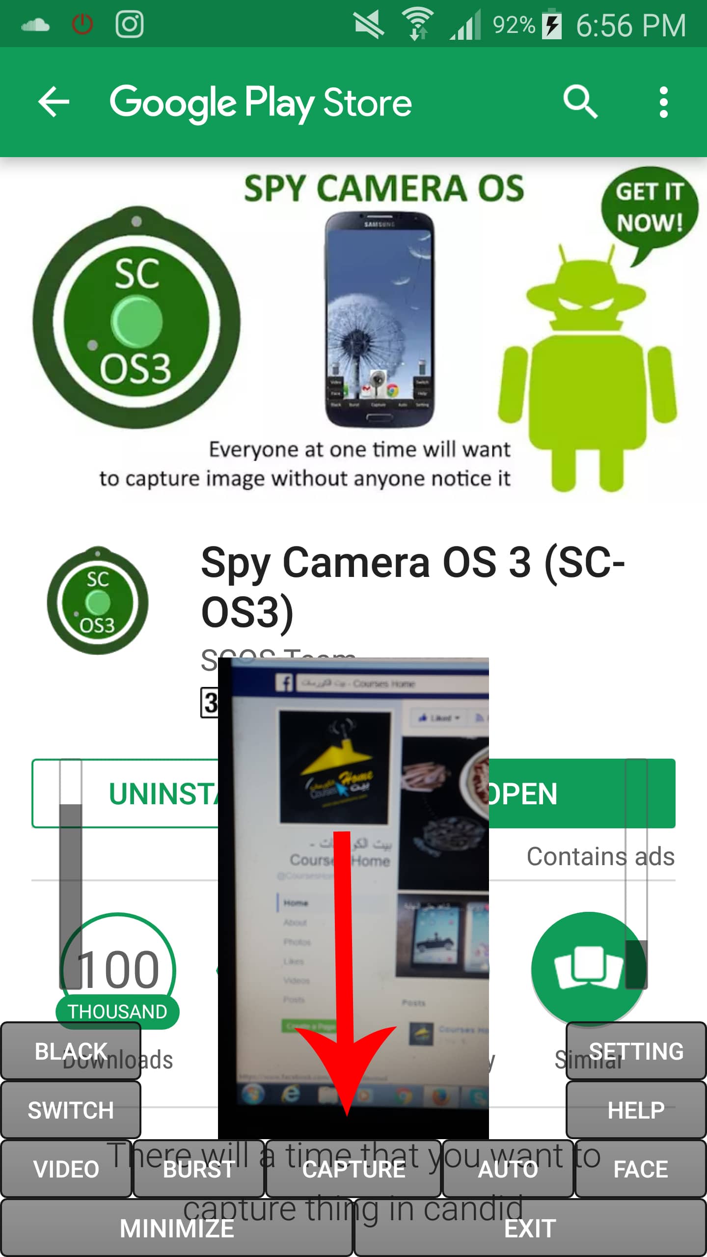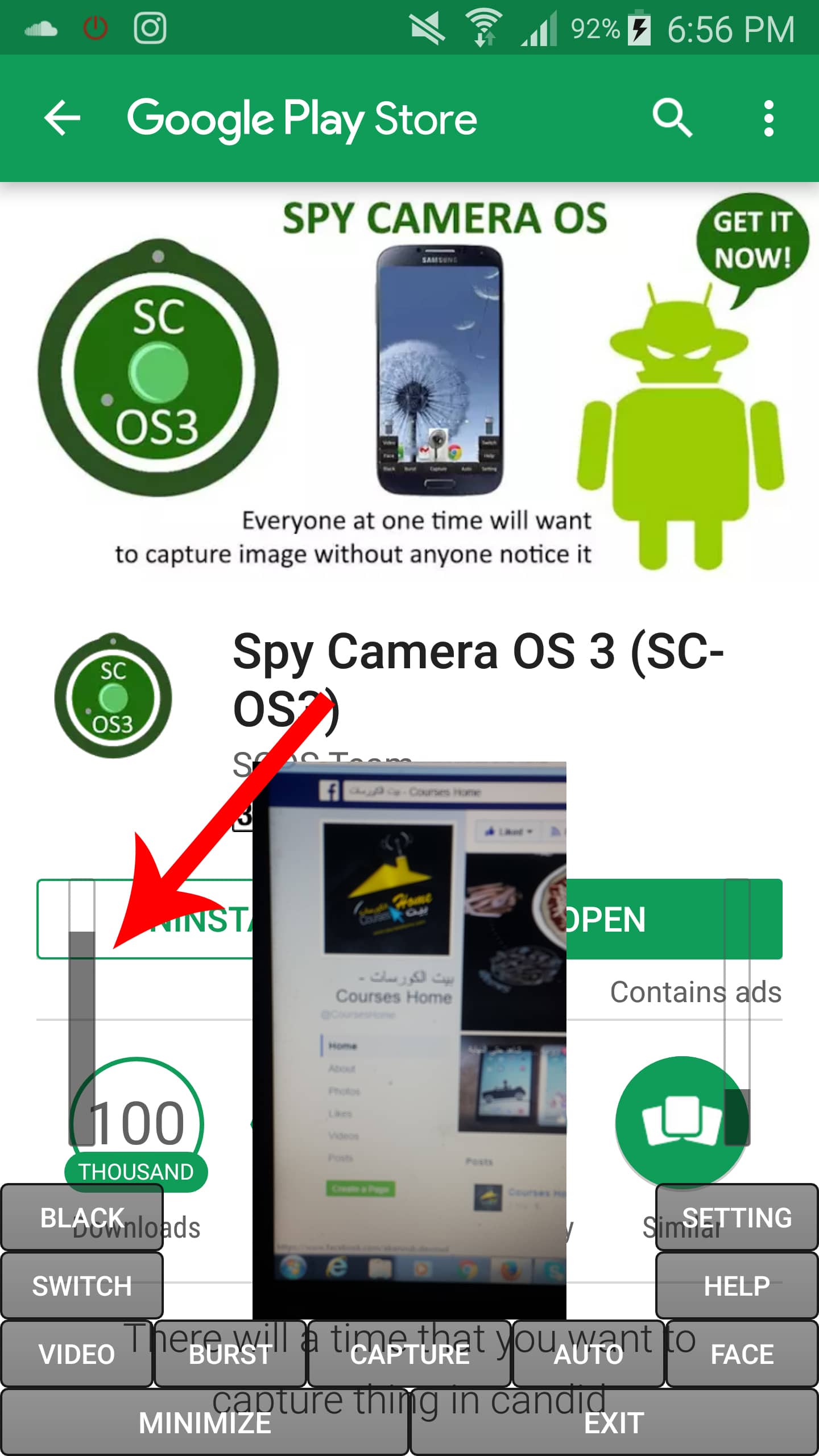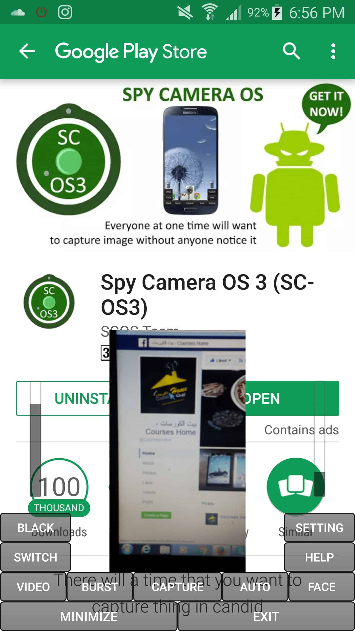 - ان التطبيق يظهر فوق أي تطبيق تستخدمه أي يظهر فوق الفيس بوك فيشعر من حاولك انك تتصفح ولا تقوم بالتصوير .