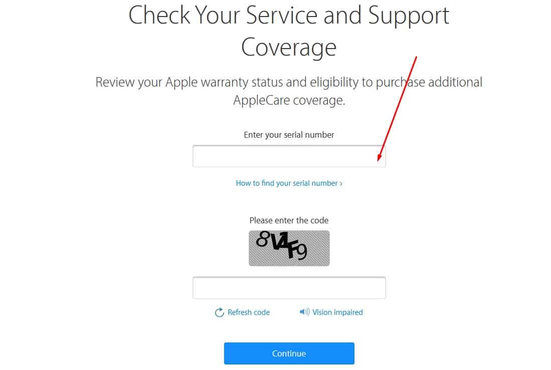 - حتي تنتقل إلي الموقع الرسمي الخاص بشركة ابل قم بالضغط هنا وستظهر أمامك واجهة الموقع قم بإدخال الرقم التسلسلي الموجود على هاتفك الايفون كما موضح بالصورة التالية والذي أخبرتك على خطوات الحصول عليه من خلال الفقرة السابقة .